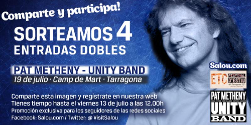 Tarragona. Costa Daurada. Amb l'arribada del bon temps comença el degoteig de concerts i espectacles a l'aire lliure. Des de Salou.com us ho volem posar fàcil i repartirem durant tot l'estiu entrades per gaudir de franc dels millors esdeveniments de la Costa Daurada, entrades que només podran aconseguir els nostres seguidors a les xarxes socials. El primer sorteig serà el divendres 13 de juliol, en el qual regalarem 4 entrades dobles per viure en directe el concert de Pat Metheny Unity Band a Tarragona, que actuaran el proper 19 de juliol a les 22.00h al Teatre Auditori Camp de Mart de la capital romana, en el marc del Festival d'Estiu de Tarragona (ETC). Cal destacar que aquesta és la única oportunitat de veure en directe a Catalunya un mite del jazz contemporani i la seva nova formació estel·lar. Per participar en el sorteig i optar a guanyar una entrada doble per aquest gran concert només has de complir dos requisits: 1. Ser fan de les nostres xarxes socials i compartir el sorteig. Fes-te amic de Salou.com al Facebook i comparteix Segueix @visitSalou al Twitter i fes RT 2. Omplir el formulari que tens a continuació Introdueix les teves dades de contacte: nom, mail i telèfon. Especifica en el comentari en quina o quines xarxes socials ens segueixes. El termini per participar en el sorteig finalitzarà el proper divendres 13 de juliol a les 12.00h. Aquella mateixa tarda anunciarem els guanyadors a les xarxes socials.