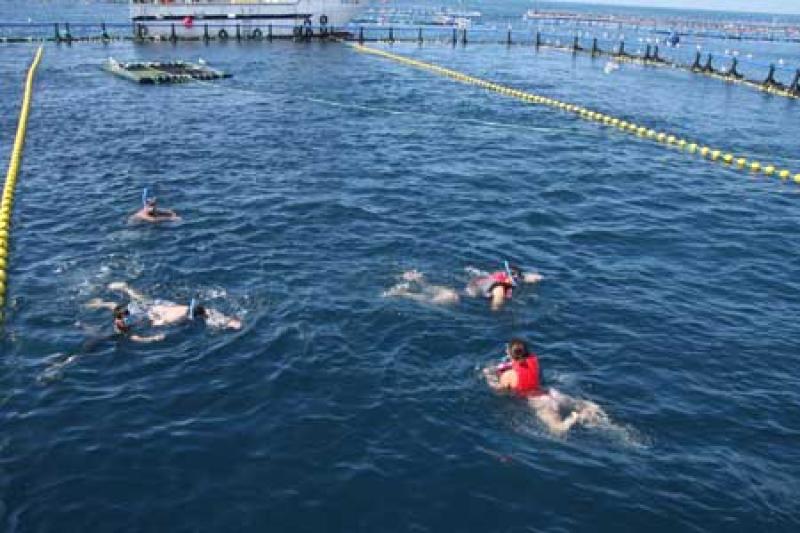 D'aquí a pocs minuts ens banyarem en contacte amb la tonyina vermella de la Mediterrània. Ens col·loquem les armilles salvavides, les ulleres d'immersió i, a poc a poc, anem entrant al mar. La temperatura de l'aigua és d'uns 22 graus. Un cop aclimatats a l'aigua ens mantenim quiets a la superfície, gairebé immòbils. És la millor posició per veure passar els grups de tonyines amb els que compartim el bany. L'experiència és única, passen una i altra vegada i la sensació és de sorpresa contínua.