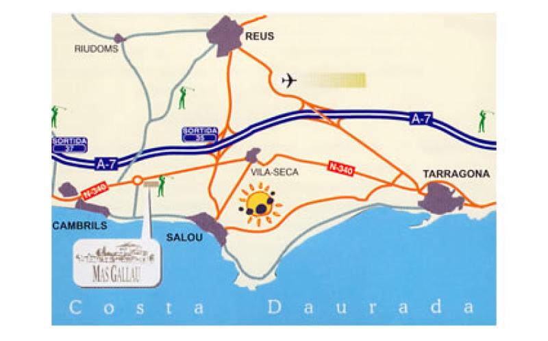 Hotels in Cambrils, Costa Dorada. Mas Gallau is located on the Costa Dorada, next to Club Par 3 Cambrils golf. It has large outdoor swimming pool with sauna and pitch & putt.