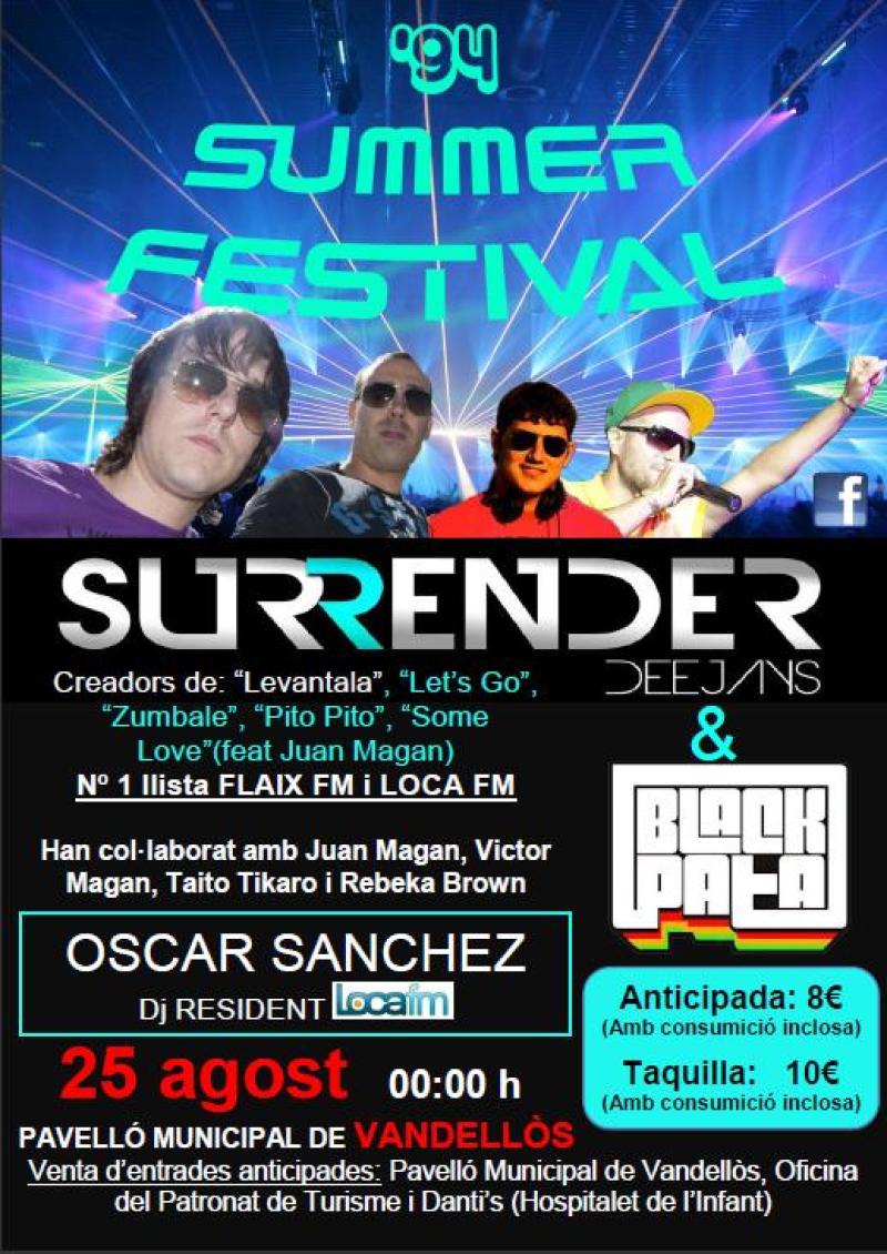 The Centre Cultural, Esportiu i Recreatiu of Vandellòs (CCERV) has organised with the youngsters of the village been born in 1994 the "94 SUMMER FESTIVAL", with the collaboration of the City council and the sponsorship of several local companies. This festival will celebrate the next 25 of August, from the 00 hours, to the municipal pavilion of Vandellòs and will count with the performances of "Surrender ", number 1 of the list of Flash FM and Loca FM; and of the dj Óscar Sánchez.