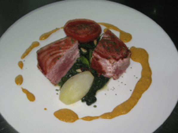 Nombre del Restaurante: El Solomillo Nombre del cocinero: Marc Poirier Tipo de cocina: Mediterránea Capacidad : 40 personas Horario de cocina:: De 13 a 16h y de 20 a 23h Descanso semanal Lunes: Precio del menú 25 euros (con iva incluido) Dirección: Port Esportiu – L’Hospitalet de l’Infant Propuesta de menú: Entrante: ---- Primer plato: Carpaccio de salmón ahumado al aceite de naranja y eneldo. Segundo Plato: Atún de l’Almadrava con romesco, piñones y pasas. Postres: Tulipa de sorbete y frutas rojas. Bodega (detallar nombre del vino y bodega):J.Miquel Jané Sauvignon Blanc 2009 D.O.Penedès. Atún rojo de l’Almadrava con romesco, piñones y pasas Ingredientes para 4 personas - 1kg. de atún rojo limpio - ½ kg. de espinacas - 150 gr. de piñones - 150 gr. de pasas - Salsa romesco RECETA En una sartén se saltean los piñones y las pasas y se reservan. En la misma sartén se saltean las espinacas y luego se mezcla todo. En otra sartén se marca el atún, vuelta y vuelta. Para emplatar ponemos una base de salsa romesco, en el fondo del plato, colocamos un” bouquet” de espinacas, piñones y pasas y encima el taco de atún, cortado en dos partes. Adornamos con escamas de sal.
