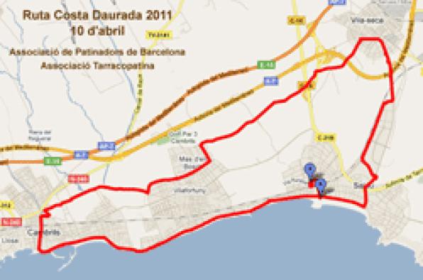 Salou. Vila-seca. Cambrils. Costa Dorada. El próximo domingo 10 de abril de 2011, las asociaciones de patinaje Asociación TarracoPatinA y Asociación de Patinadores de Barcelona (APB), realizarán la Ruta Costa Dorada 2011 con patines. La ruta comenzará en la estación de trenes de Salou a las 11.30hs y recorrerá las poblaciones de Salou, Vila-seca y Cambrils, para volver a Salou en los alrededores de las 14h30. El recorrido, de unos 25 kilómetros, se hará principalmente por paseos marítimos y carriles bici, así como pistas y caminos asfaltados de las diferentes localidades. La ruta, que puede llegar a alcanzar el número de 200 participantes, dispondrá de un dispositivo de seguridad formado por patinadores de ambas asociaciones, y contará con la ayuda puntual de la Policía Local de alguno de los municipios. El nivel de dificultad de la ruta no es muy alto. No obstante, se requiere que los patinadores y patinadoras sepan frenar y girar correctamente, y que tengan suficiente experiencia como para lograr una ruta de esta distancia y características. La finalidad de la ruta es puramente lúdica. Se trata de una actividad saludable al aire libre usando un medio de desplazamiento ecológico, a la vez que una concentración de personas amantes de este deporte. La ruta se hace con la colaboración de los ayuntamientos de Salou, Vila-seca y Cambrils, y cuenta con el apoyo de la Federación Catalana de Patinaje.